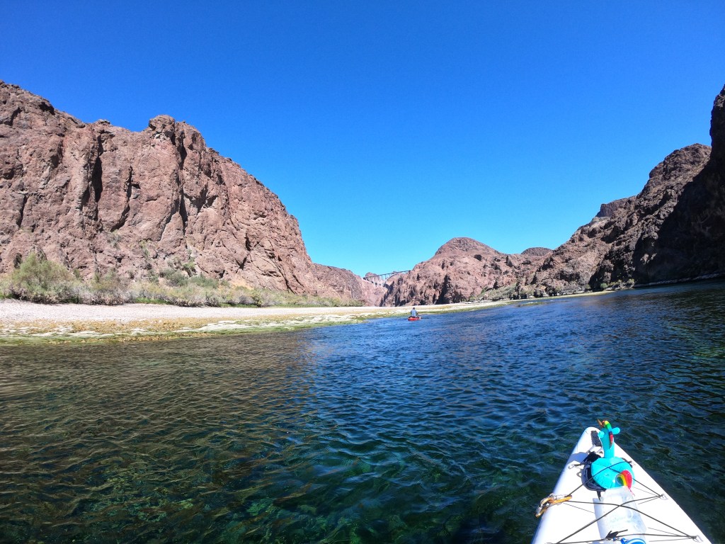 Leaving our camp in place, we continued to paddle upstream with our lighter boards. We battled our way up river, but the combination of current and 40 mph head wind was really too much. We were forced to paddle from our knees to make any progress. We stopped at Boy Scout Canyon to self-motivate to make the push to Gold Strike Canyon. We didn’t make it. Portaging our boards up the beach directly opposite Palm Tree Hot Spring, we could see the bridge on highway 93. I think that we could have made it to the dam without the wind. It will just need to happen some other time.