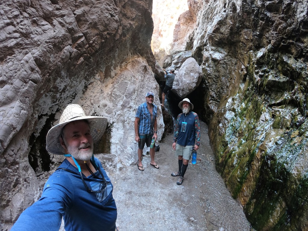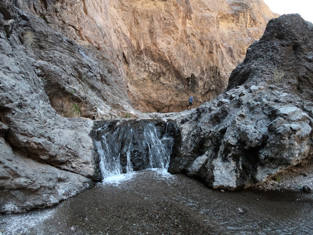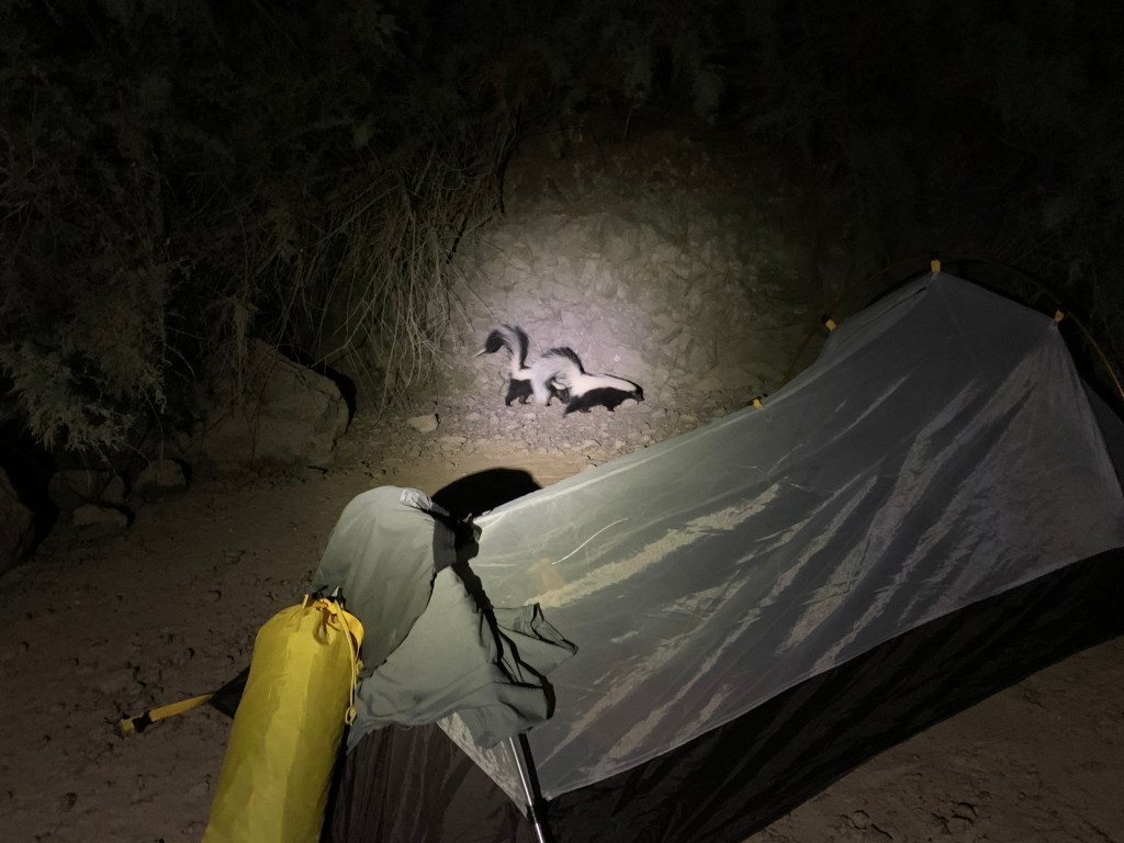 Following dinner we visited Arizona Hot Springs for a pre-bed soak. The ladder to the upper grotto was no longer in place, but the lower pools below were dammed to create nice tubs. We were the only ones there which made it easy to stay for about an hour. The night ended with us trying to shoo the two striped skunks away. They had no intention of leaving, so the two of us sleeping on the ground kept waking up to them sniffing around our heads. All our food was hanging up so they were not able to raid us. But waking up to a skunk a foot from your face is unnerving.